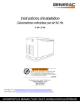 GE Home Generator Systems Groupe électrogène N o R tf ep o r ro du ct io n Manuel d’installation et démarrage Nous vous remercions d’avoir acheté cette génératrice résidentielle de ualité GE. Nous sommes heureux ue vous fassiez confiance à la marue GE. Lorsue utilisée et entretenue selon les instructions de ce manuel, votre génératrice GE vous offrira de nombreuses années de service fiable. Ce manuel contient des renseignements sur la sécurité pour vous informer des dangers et des risques associés aux groupes électrogènes ainsi que de la façon de les éviter. Le groupe électrogène est conçu pour être utilisé comme génératrice résidentielle auxiliaire fournissant une source d’électricité alternative et pour desservir des charges comme le chauffage, les systèmes de réfrigération et les systèmes de communication qui, lorsqu’ils sont arrêtés durant une panne d’électricité, peuvent causer de l’inconfort ou des inconvénients. Conservez ces instructions d’origine pour référence future. Cette génératrice résidentielle auxiliaire exige une installation par un professionnel avant d’être utilisée. Votre installateur doit suivre ces directives à la lettre. Où nous trouver Pour la future référence n Vous n’aurez jamais à chercher bien loin pour trouver un centre de soutien et service pour votre génératrice. Consultez les Pages Jaunes. De nombreux distributeurs de service après-vente agréés GE offrent un service de qualité. Vous pouvez également communiquer avec le service à la clientèle en téléphonant sans frais au 888 575 8226 de 8 h à 17 h HNC, ou cliquez sur SERVICE & SUPPORT à www.homestandbygeneratorsystems.com, qui procure une liste des détaillants autorisés. N o R tf ep o r ro du ct io Veuillez fournir les renseignements suivants et les conserver avec votre reçu pour vous aider dans l’identification de l’appareil lors de vos prochains achats d’équipement. Date d’achat Génératrice Numéro de modèle Révision Numéro de série Moteur Numéro de modèle 70 Table des matiêres Directives importantes . . . . . . . . . . . . . . . . . . . . . . . . . . . . . . . . . . . . . . . . . 72 Veuillez conserver ces instructions . . . . . . . . . . . . . . . . . . . . . . . . . . . . . . . . . . . . . . . . . . . . . . . . . 72 Installation . . . . . . . . . . . . . . . . . . . . . . . . . . . . . . . . . . . . . . . . . . . . . . . . . . . . 76 N o R tf ep o r ro du ct io n Responsabilités du propriétaire . . . . . . . . . . . . . . . . . . . . . . . . . . . . . . . . . . . . . . . . . . . . . . . . . . . . 76 Responsabilités du détaillant/de l’entrepreneur chargé de l’installation . . . . . . . . . . . . . . . 76 Trousse pour les temps froids . . . . . . . . . . . . . . . . . . . . . . . . . . . . . . . . . . . . . . . . . . . . . . . . . . . . . 76 Précautions lors du déballage . . . . . . . . . . . . . . . . . . . . . . . . . . . . . . . . . . . . . . . . . . . . . . . . . . . . . 77 Vérification de la livraison . . . . . . . . . . . . . . . . . . . . . . . . . . . . . . . . . . . . . . . . . . . . . . . . . . . . . . . . 77 Contenu de la boîte . . . . . . . . . . . . . . . . . . . . . . . . . . . . . . . . . . . . . . . . . . . . . . . . . . . . . . . . . . . . . . 77 Liste de vérification d’installation . . . . . . . . . . . . . . . . . . . . . . . . . . . . . . . . . . . . . . . . . . . . . . . . . 78 Mise en place de la génératrice . . . . . . . . . . . . . . . . . . . . . . . . . . . . . . . . . . . . . . . . . . . . . . . . . . . . 78 Mise en place de la génératrice de secours pour réduire le risque d’empoisonnement au monoxyde de carbone . . . . . . . . . . . . . . . . . . . . . . . . . . . . . . . . . . . . . . 79 Mise en place de la génératrice de secours pour réduire le risque d’incendie . . . . . . . . . . . 81 AUTRES directives générales concernant l’emplacement . . . . . . . . . . . . . . . . . . . . . . . . . . . . . 83 Exigences et tests de la norme NFP37 de la National Fire Protection Association . . . . . . . 83 Emplacements de l’admission du combustible et de l’entrée électrique . . . . . . . . . . . . . . . . 84 Soulèvement de la génératrice . . . . . . . . . . . . . . . . . . . . . . . . . . . . . . . . . . . . . . . . . . . . . . . . . . . . 84 Portes d’accès . . . . . . . . . . . . . . . . . . . . . . . . . . . . . . . . . . . . . . . . . . . . . . . . . . . . . . . . . . . . . . . . . . . 85 Le système de combustible gazeux . . . . . . . . . . . . . . . . . . . . . . . . . . . . . . . . . . . . . . . . . . . . . . . . 87 Conversion du combustible . . . . . . . . . . . . . . . . . . . . . . . . . . . . . . . . . . . . . . . . . . . . . . . . . . . . . . . 89 Consommation de combustible . . . . . . . . . . . . . . . . . . . . . . . . . . . . . . . . . . . . . . . . . . . . . . . . . . . . 89 Connexions de système . . . . . . . . . . . . . . . . . . . . . . . . . . . . . . . . . . . . . . . . . . . . . . . . . . . . . . . . . . . 90 Système de branchement C.A. de la génératrice . . . . . . . . . . . . . . . . . . . . . . . . . . . . . . . . . . . . 91 Mise à la masse de la génératrice . . . . . . . . . . . . . . . . . . . . . . . . . . . . . . . . . . . . . . . . . . . . . . . . . . 91 Interconnexions du circuit de commande . . . . . . . . . . . . . . . . . . . . . . . . . . . . . . . . . . . . . . . . . . . 92 Communication du commutateur de transfert . . . . . . . . . . . . . . . . . . . . . . . . . . . . . . . . . . . . . . 92 Système de détection des pannes . . . . . . . . . . . . . . . . . . . . . . . . . . . . . . . . . . . . . . . . . . . . . . . . . . 93 Tableau de commande du système . . . . . . . . . . . . . . . . . . . . . . . . . . . . . . . . . . . . . . . . . . . . . . . . 93 Dalle en béton (en option) . . . . . . . . . . . . . . . . . . . . . . . . . . . . . . . . . . . . . . . . . . . . . . . . . . . . . . . . . 94 La B